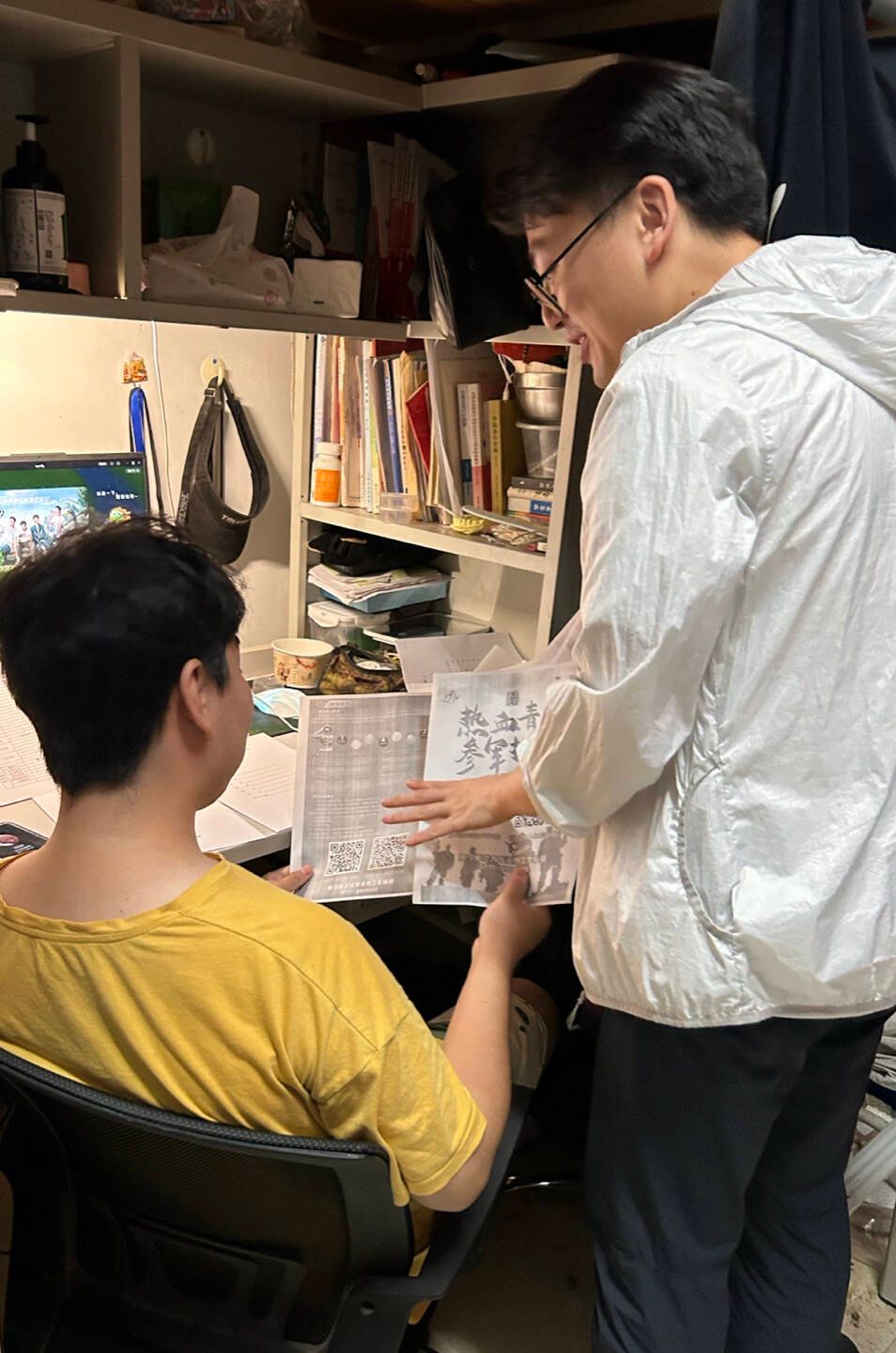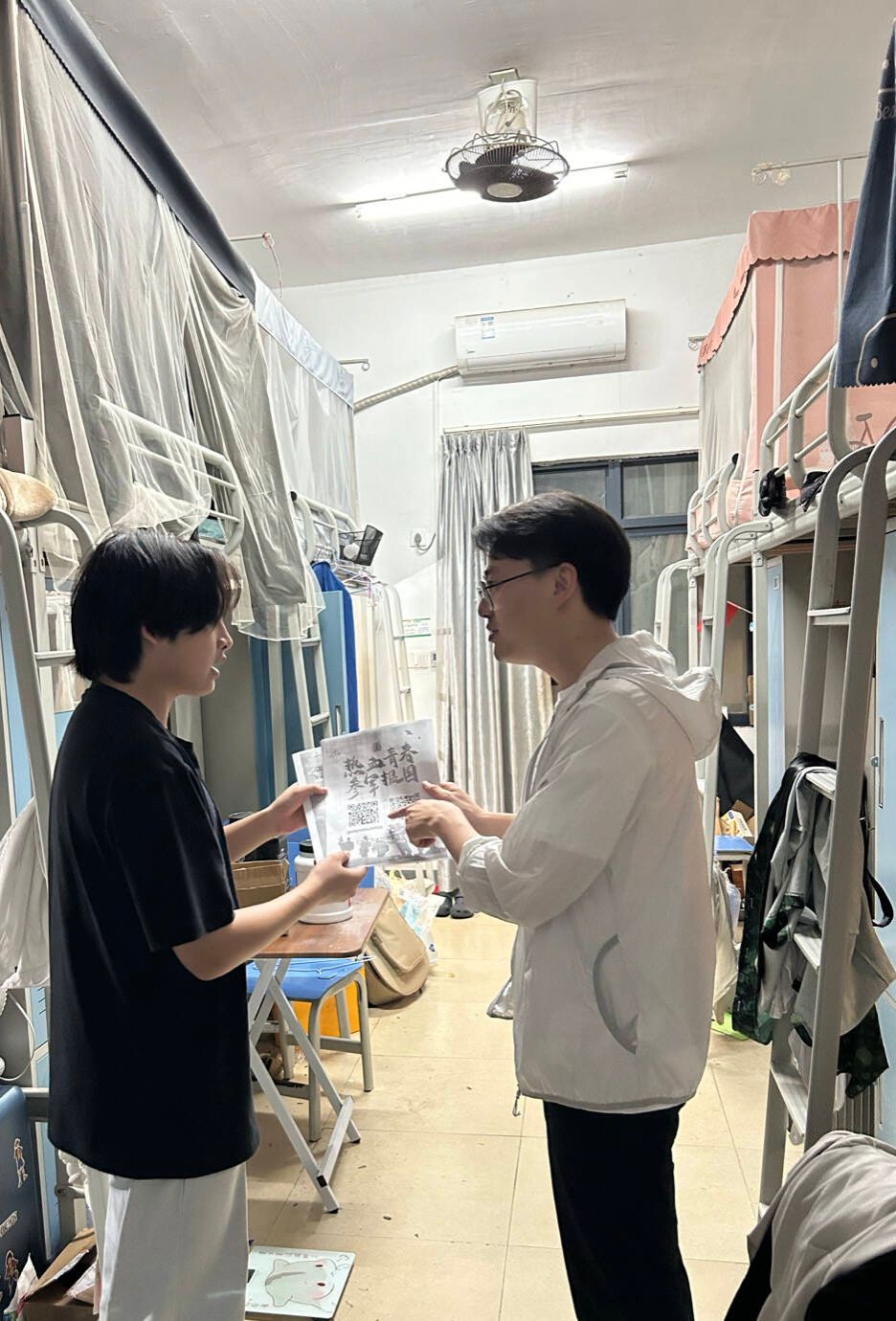张宇老师通过抓住毕业生离校前期,深入毕业生寝室进行一对一、面对面的征兵宣讲征兵相关政策,针对大学生入伍政策、参军报名时间、入伍流程、入伍条件等内容作了详细介绍,同时对有意愿应征入伍的学生进行细致讲解与答疑,并发放《2023年大学生应征入伍指南》。