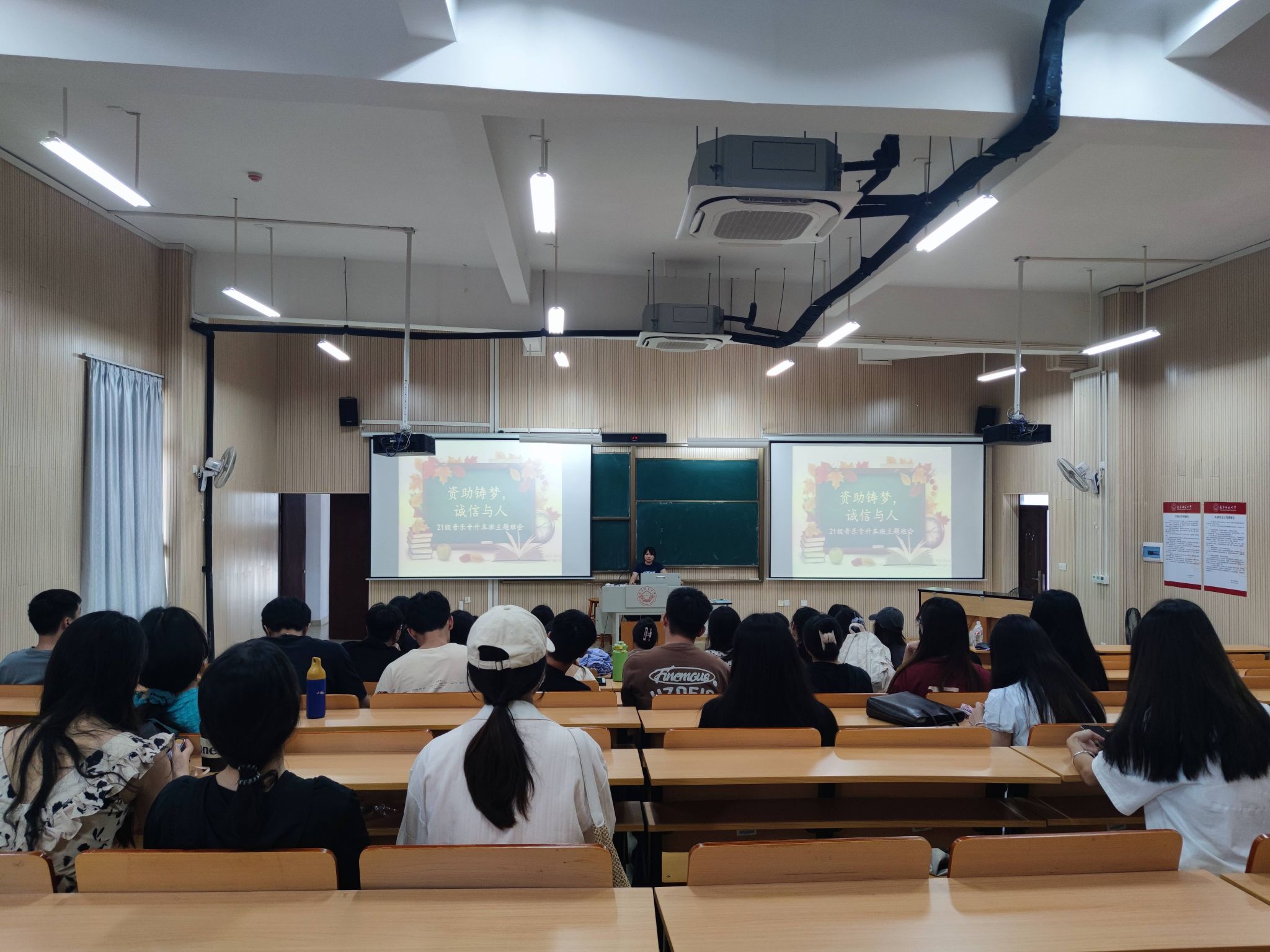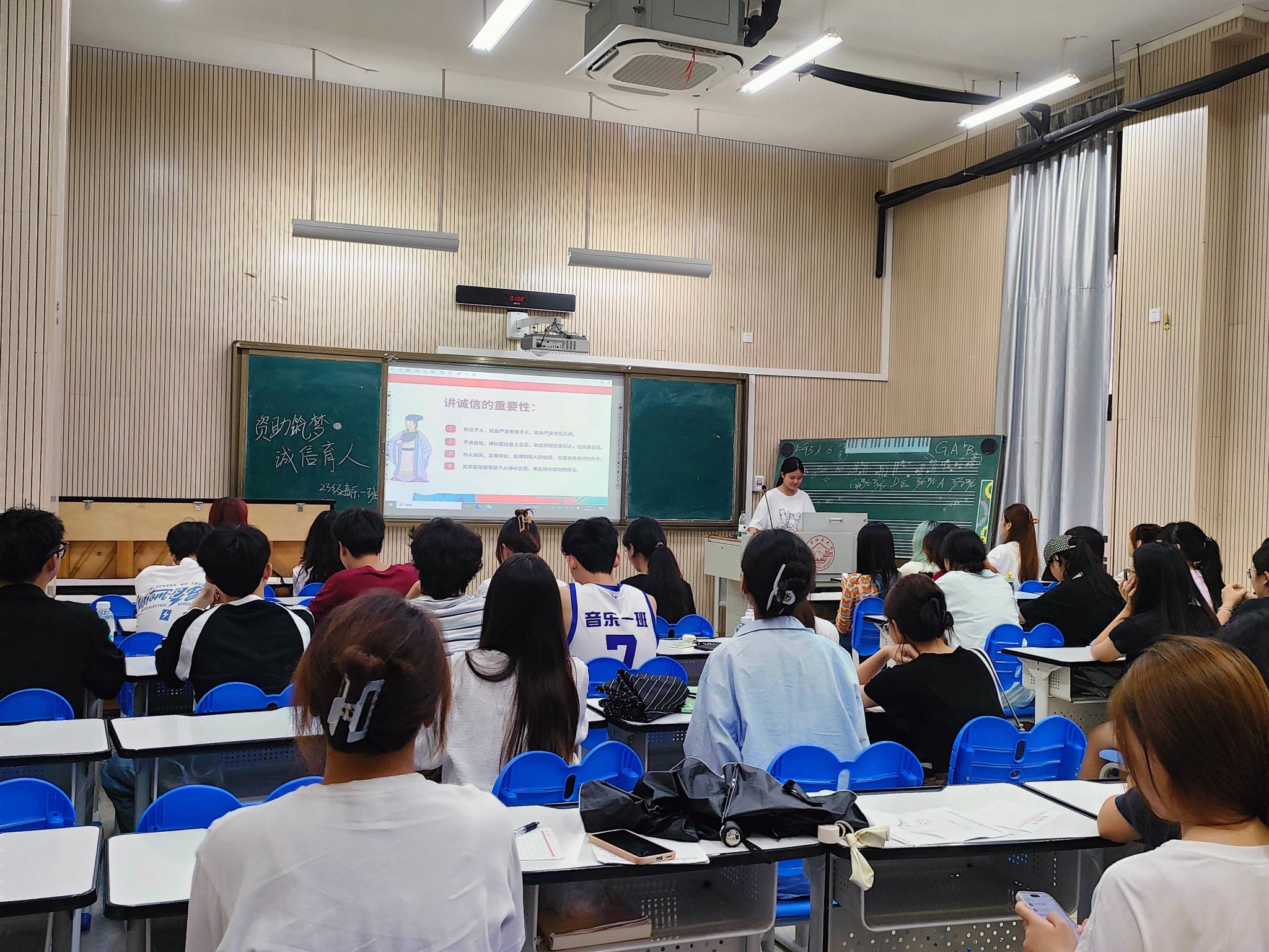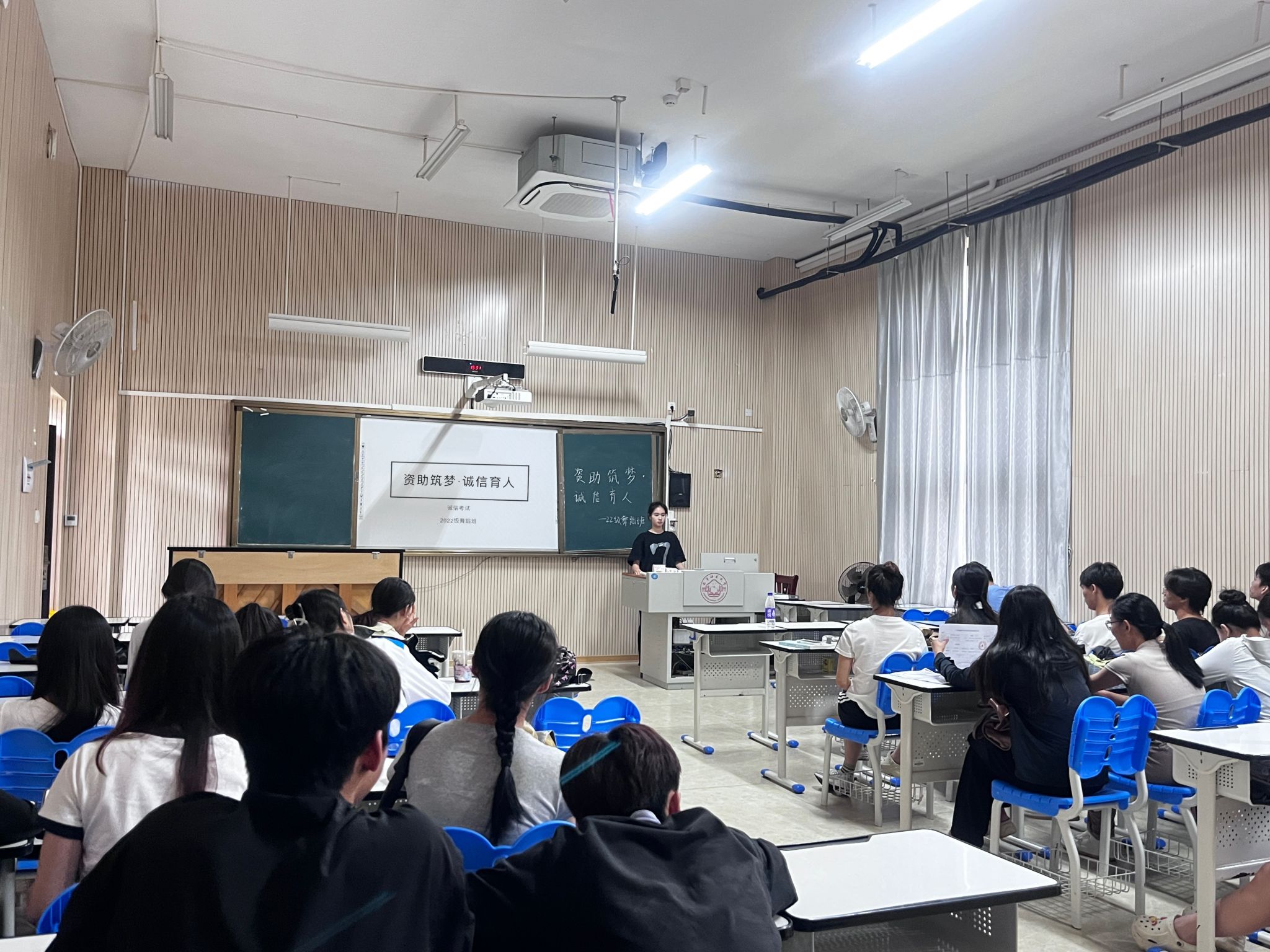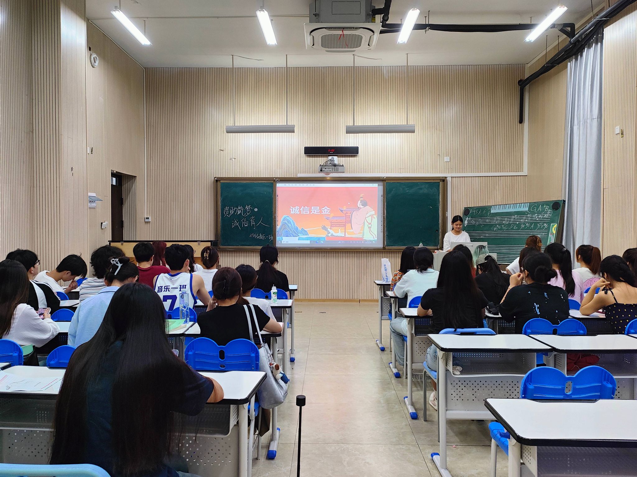 各班班会形式新颖、内容丰富,以实际案例、视频、歌曲、名言警句、承诺宣誓等形式阐述了大学生应该具备诚信品质。其中,2022级音乐1班以“文明考风·诚信考试”为阐释了诚信的重要性及如何在考试中遵守考场纪律,并通过一些违纪的案例展示了作弊的危害性。随后,同学们从多角度谈了一诺千金、言而有信等名言警句的理解,营造出了良好的班风和学风。最后,介绍了国家助学贷款政策、申请助学贷款基本流程以及学校资助政策体系,为家庭经济困难学生提供经济上的支持,并提醒大家今后诚信还贷,学会在逆境中保持积极乐观的心态。