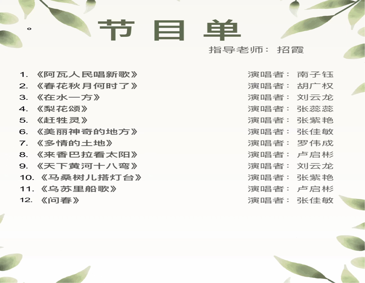 本次活动采用了一场别开生面的音乐会形式进行,在一曲热情洋溢、充满民族风情由南子钰同学带来的《阿瓦人民唱新歌》中缓缓拉开帷幕。这首歌曲以其独特的旋律和节奏,迅速点燃了现场观众的热情,仿佛将人们带入了一个充满活力和希望的新世界。音乐会的舞台布置得既简约又不失华丽,灯光随着音乐的节奏变换着色彩,营造出一种梦幻般的氛围。随着音乐会的进行,一系列精彩纷呈的曲目依次上演,每首曲目都精心挑选,旨在展现春天的生机与活力。其中,由张佳敏同学带来的一首悠扬的《问春》作为压轴曲目,其旋律轻快,如同春风拂过大地,不仅传达了人们对春天的渴望与颂扬,也给在场的每一位观众留下了深刻的印象。这首曲子的演奏者们全情投入,每一个音符都仿佛在诉说着春天的故事,让人仿佛置身于一个万物复苏、生机勃勃的季节之中。