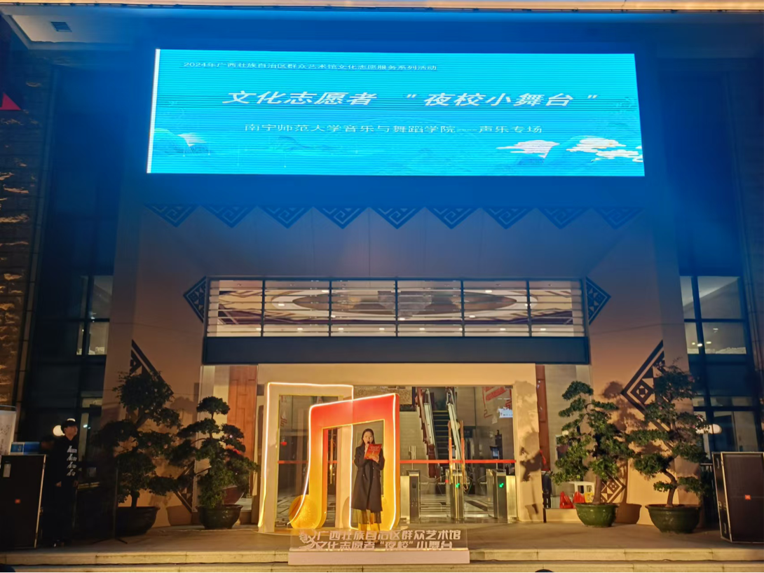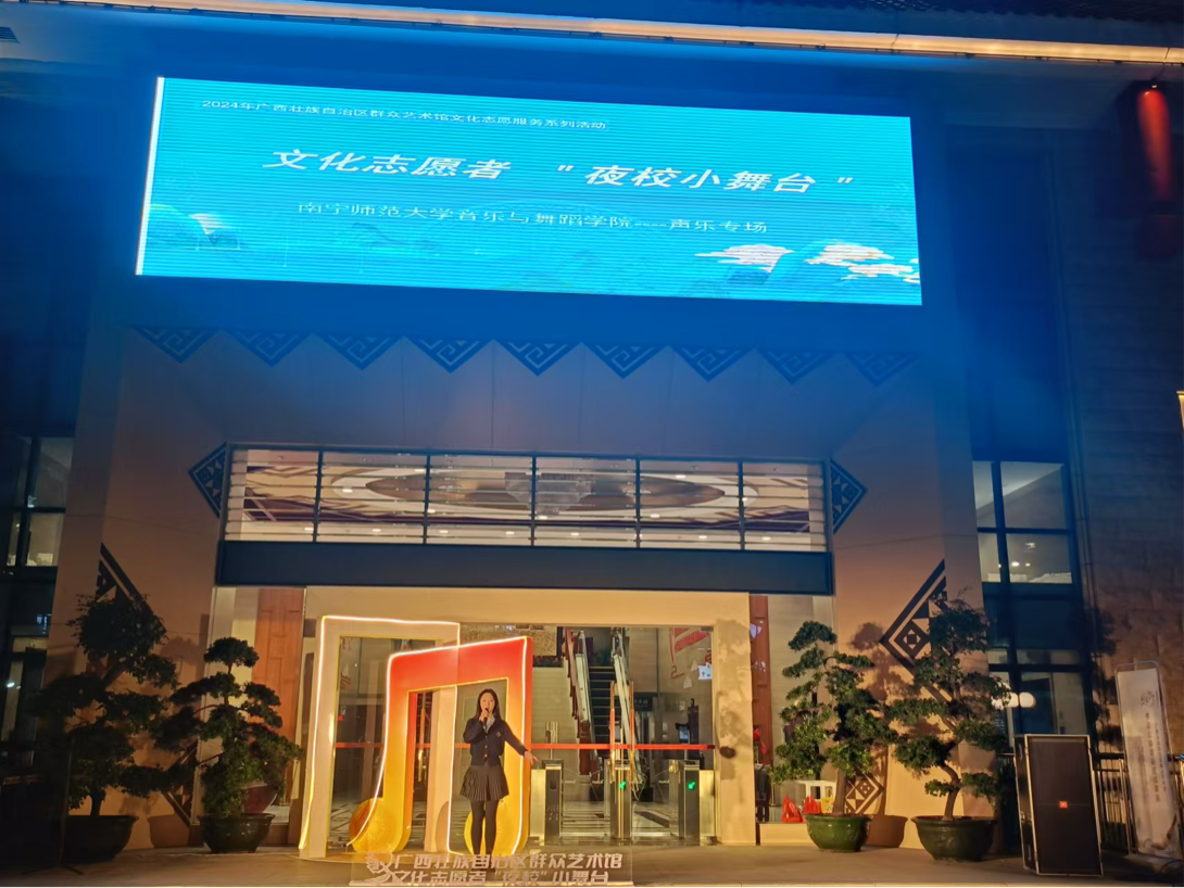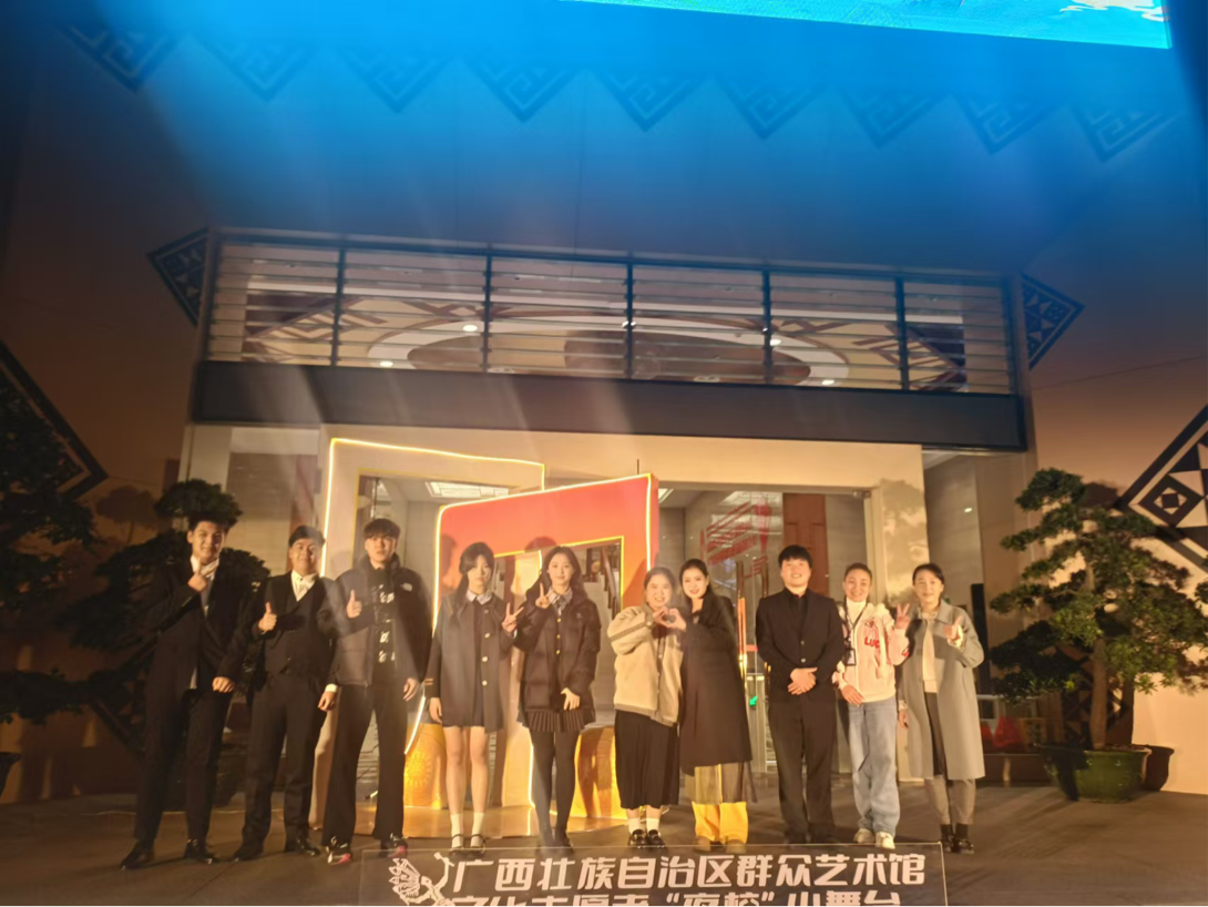 12月24日,必赢3003no1线路检测中心招霞教授的学生一行8人受邀参加了南宁市2024年广西群众艺术馆文化志愿者“夜校”小舞台活动。此次活动由广西群众艺术馆和必赢3003no1线路检测中心共同发起,旨在推动志愿服务事业发展,提升南宁市志愿服务水平。