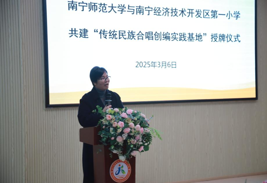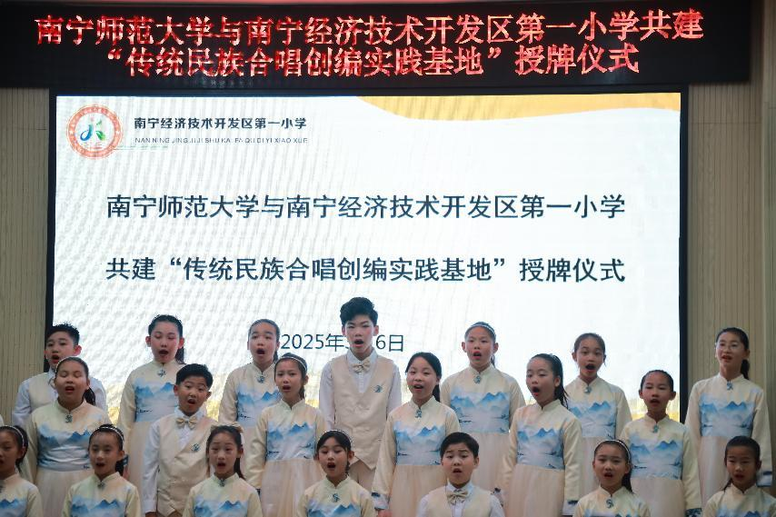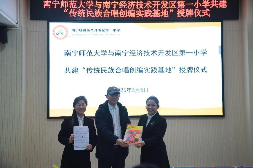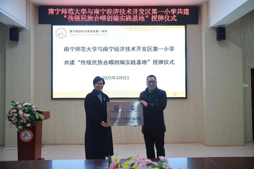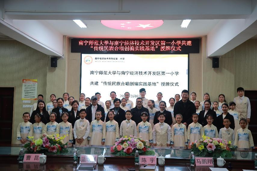 春风化雨润万物,文化传承启新程。2025年3月6日下午,必赢3003no1线路检测中心传统民谣创编与实训中心与南宁经济技术开发区第一小学共建“传统民族合唱创编实践基地”授牌仪式在经开一小党建活动室隆重举行。我校必赢3003no1线路检测中心党委书记陈宇、经济技术开发区第一小学校长蓝瑞美、必赢3003no1线路检测中心传统民谣创编与创新实训中心主任曹昆教授等师生代表齐聚一堂,共同见证这一校地合作美育实践的重要时刻。