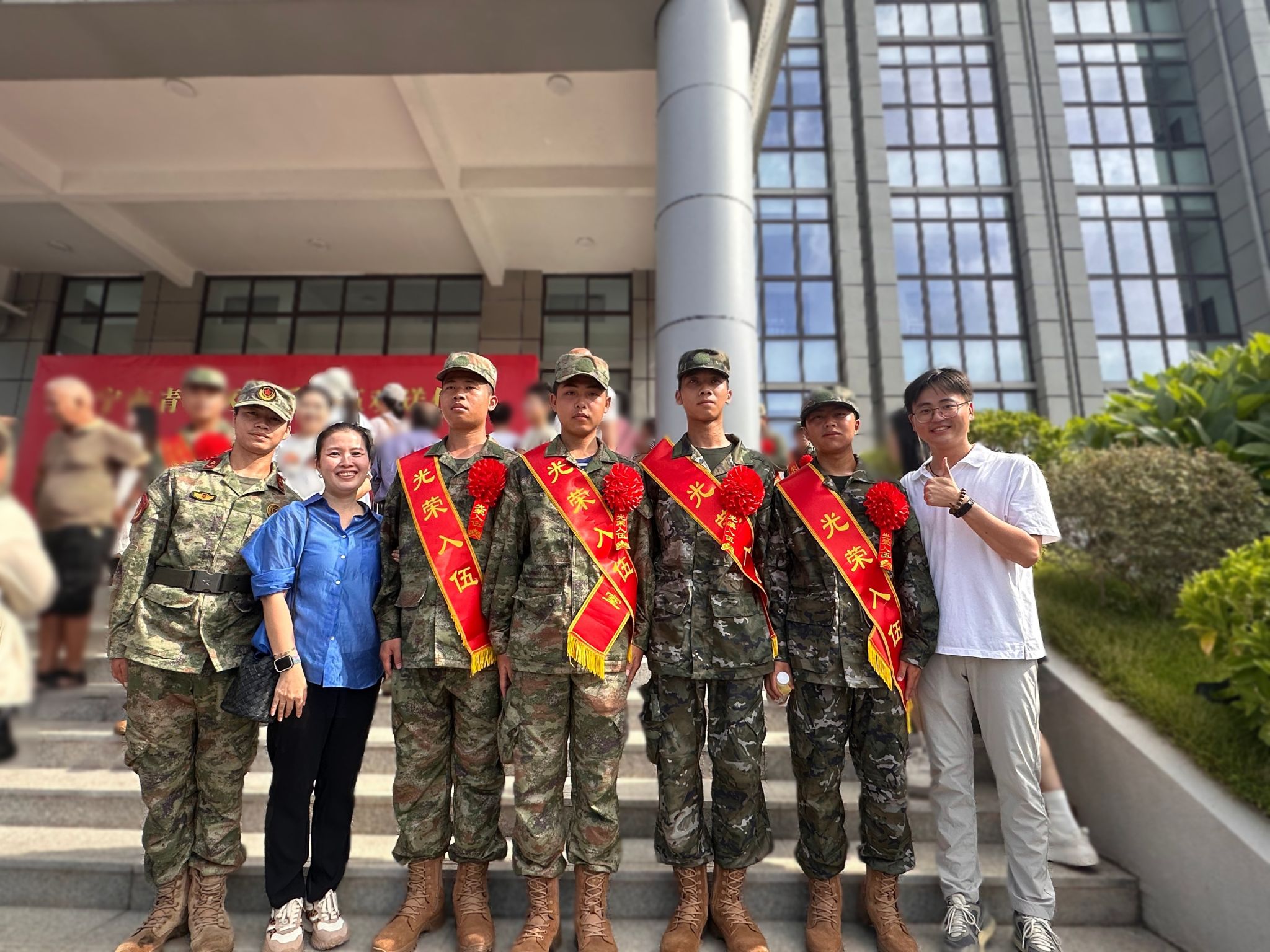 在送兵仪式现场,即将入伍的学生们身着崭新的军装,英姿飒爽,胸前的大红花鲜艳夺目。学院党委副书记龙学禧对入伍学生表达了热烈的祝贺和殷切的期望,鼓励他们到部队后,要严格要求自己,刻苦训练,努力学习军事技能和知识,将个人成长与国防事业紧密相连,为实现强国梦、强军梦贡献自己的力量。学院老师也送上祝福,叮嘱入伍学生要在部队中保持积极向上的心态,团结战友,不断提升自己。带训的学长也鼓励新兵们勇敢迎接挑战,在军队中实现自己的人生价值。