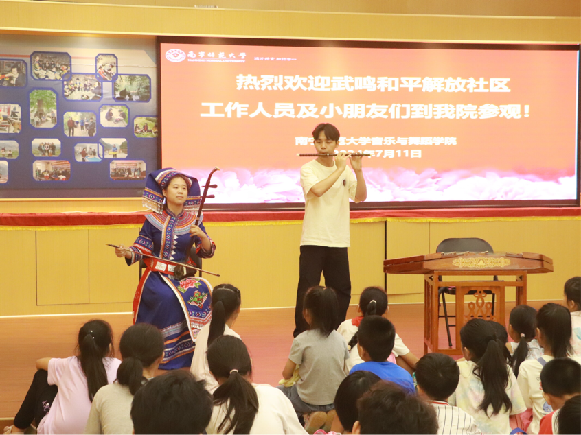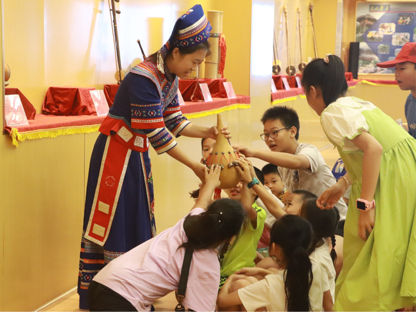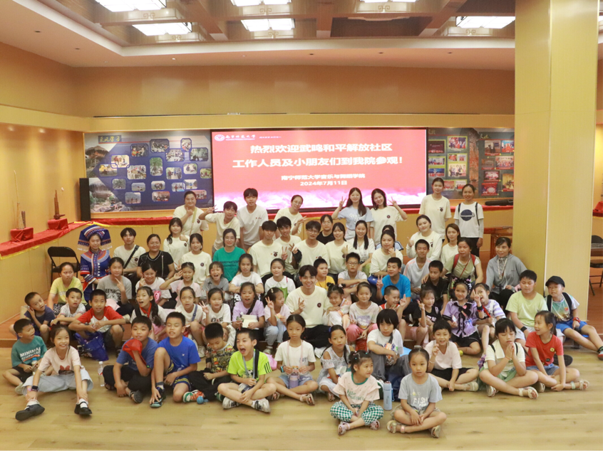7月11日上午,必赢3003no1线路检测中心“古韵新声,创承文脉”中华文化传承团组织了一场特别的暑期“三下乡”社会实践活动——邀请武鸣和平解放社区的工作人员及小朋友们一行49人参观了学院的“广西少数民族乐器研究中心”。此次活动旨在向社区和少年儿童传播广西少数民族音乐,促进他们对于民族音乐的喜爱和对中华民族文化的认同。
