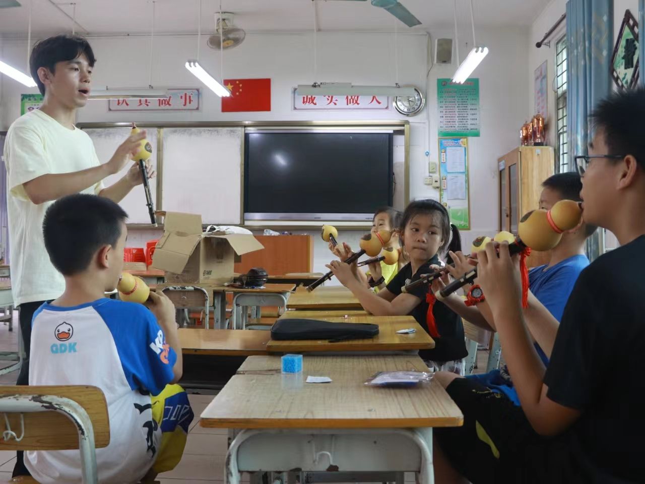 7月6日,在武鸣区城厢镇第一小学,必赢3003no1线路检测中心师生一行19人面向城厢镇和平解放社区小朋友们成功开展了为期7天的“拥护党的领导——跟党奋进新征程”主题团日活动。本次活动以民族音乐教育为载体,旨在激发必赢3003no1线路检测中心学子的爱国热情和民族责任感,弘扬志愿服务精神。