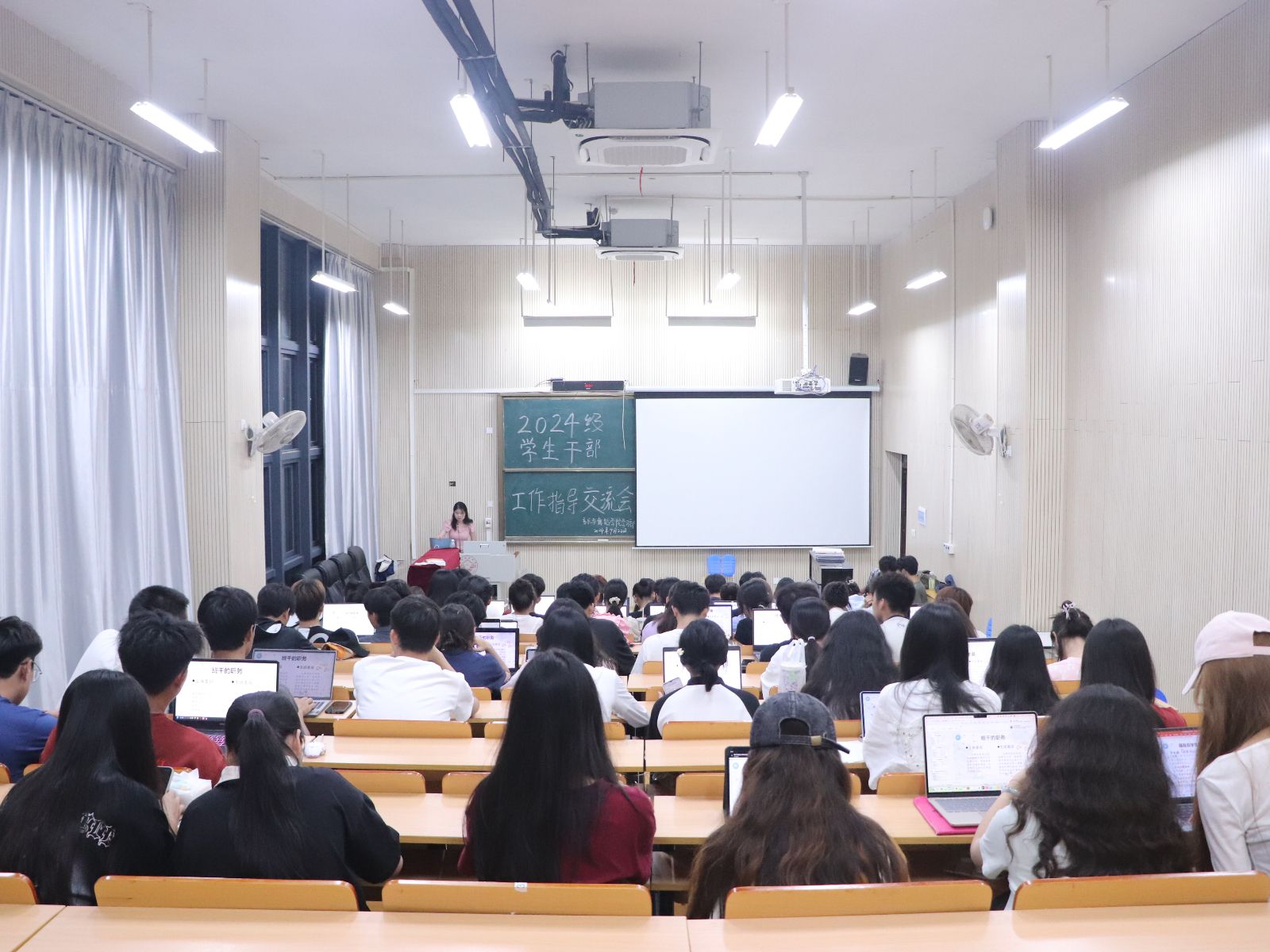 此次交流会共分为四个环节,一是班干职务以及辅导员学生管理工作分工介绍,二是word、Excel等工作常用软件,电脑实操的指导与交流,三是纪检部讲解查课、请假流程以及迟到缺勤处分细则,生活部讲解安全注意事项。四是提问环节,在提问交流环节中,学生干部门积极发言,就自己在工作中遇到的问题和困惑进行了提问和交流。学长学姐们则耐心解答,提出了具体的建议和解决方案。整个交流过程气氛热烈、互动频繁,达到了预期的效果。