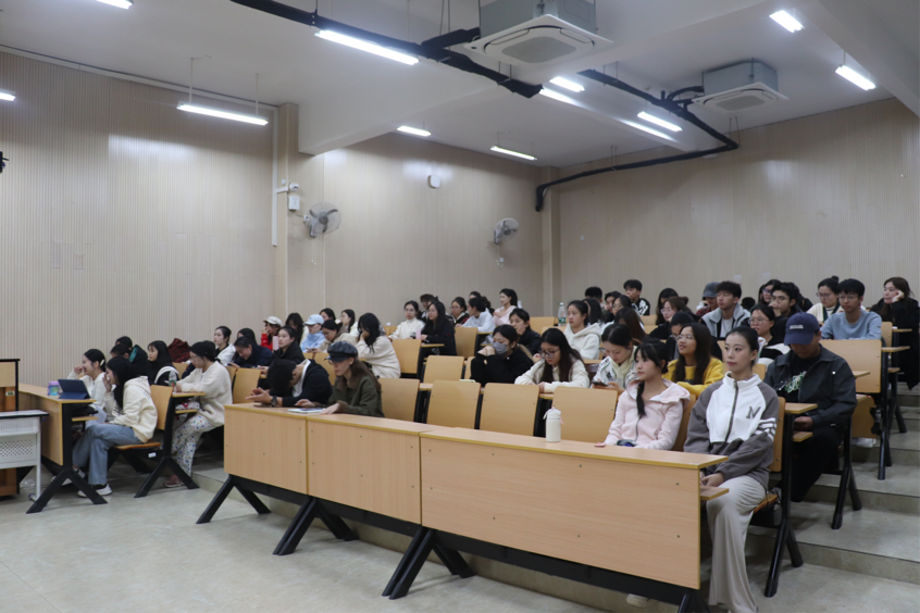 考研学习经验交流分享会分为两个环节,一是由受邀2024级研究生代表依次分享自己的考研经验,二是由现场同学向研究生代表提问交流。第一环节由研究生代表分享自己的考研经验和考研方法。他们以自身为例,从择校经验、资料准备、学习方法、心态调整等方面与在场同学分享感受和经验。第二环节,参会的同学就考研方面的问题向研究生代表提问,研究生代表逐一进行了解答。