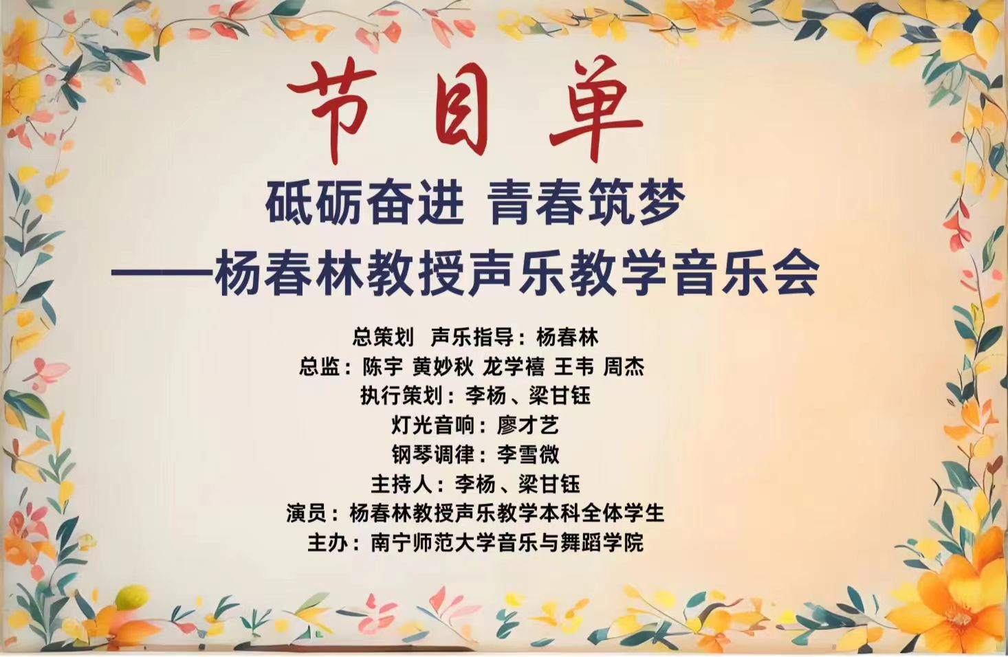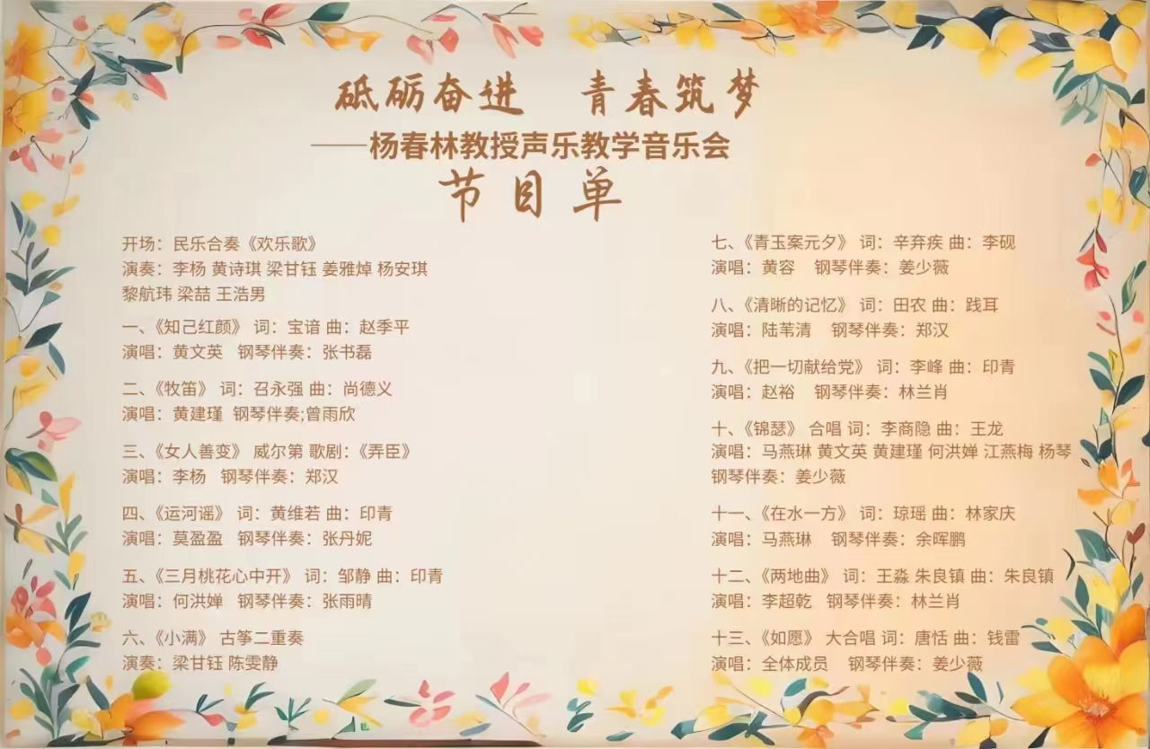 此外《运河谣》和《三月桃花心中开》这两首歌曲完美阐释了民间美景,既表现了我国的大好山河,也唱出了对国家的热爱,歌曲情感真挚,优美动听。伴随着美妙的歌声和旋律带领着大家感受大好江河。随后一曲古筝重奏《小满》的演奏,在感受夏日的恬静之中,让大家不禁“何须多虑盈亏事,终归小满胜万全”这样的美句。而后的《青玉案元夕》这首经典歌曲的国民古风在演唱者的嗓音之中得到了完美呈现,嘹亮的高音更是震撼了每一位观众的心灵。随着《把一切献给党》和《清晰的记忆》这两首激昂的演唱,唱出了党员们的心声,让大家铭记党史,更是一次对党的深情歌颂。随后为我们带来的是女声合唱《锦瑟》,清脆悦耳的歌声与优美的伴奏相互交织,表达了对那美好年华的思念,以言人生如梦,往事如烟。成为了观众们难忘的回忆。随后的《两地曲》和《在水一方》的深情演唱不禁让观众对爱情充满希望和向往,凡世间一切因受阻而难以达成的种种追求,都可在其中发生共振和情感上的共鸣,让大家对爱情充满无限憧憬。当最后一曲合唱《如愿》落下帷幕时,观众仍然遨游在音乐的海洋之中,余音绕梁。在此次音乐会中,同学们饱含热情的歌唱和演奏,向我们亲爱的杨春林老师表达崇高的敬意和爱意。感谢老师的谆谆教诲,让我们变得更加优秀,让我们增强自身实力去追逐自己的梦想。在往后的日子我们会不断砥砺奋进,紧跟老师的步伐,筑就美好的青春。砥砺前行朝着老师心中的期许努力奋斗。最后在观众们激动的掌声和欢呼声中,杨春林教授声乐教学音乐会圆满结束。