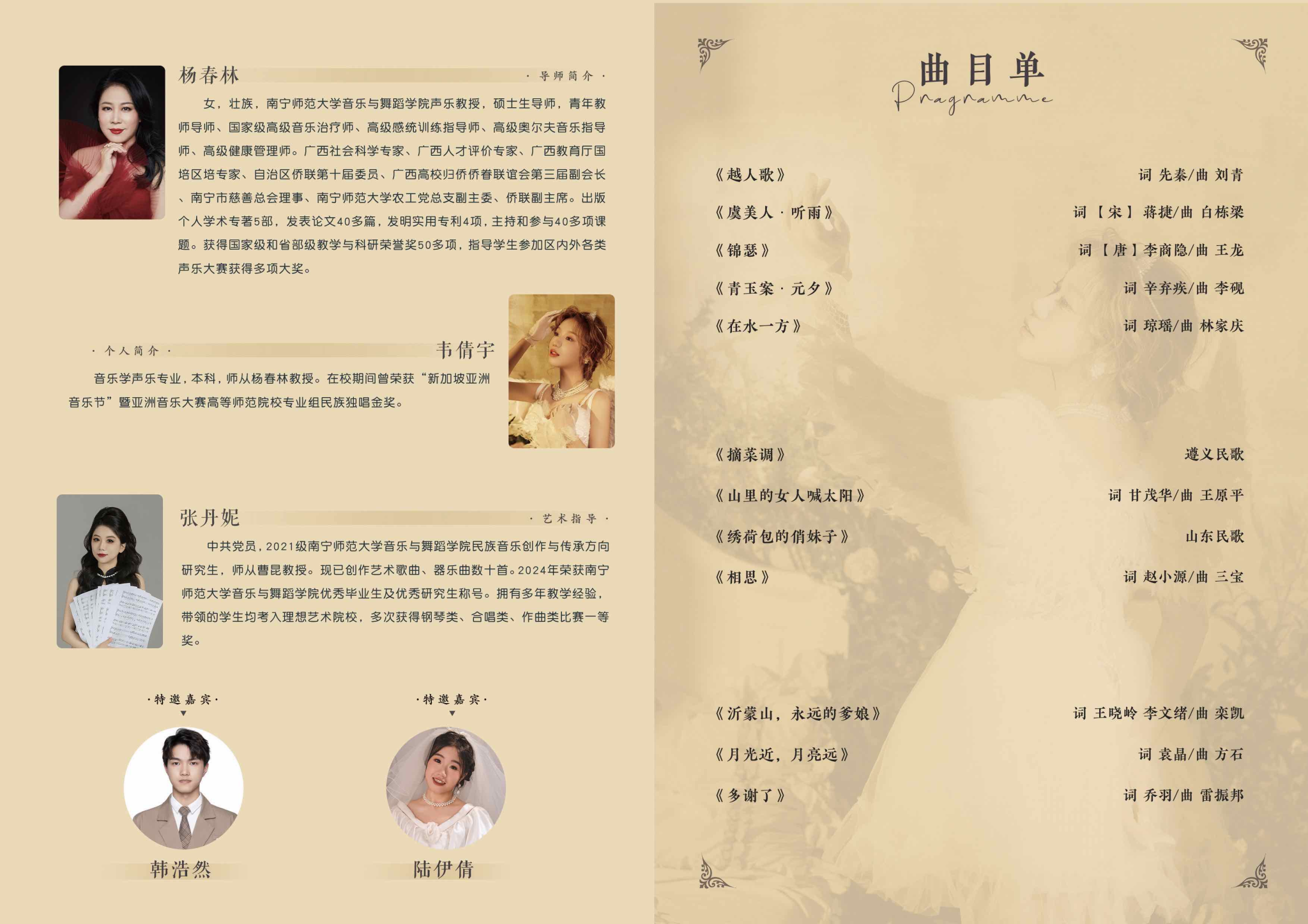 此次音乐会共分为三个部分:古诗词艺术歌曲、民族歌曲、中国歌剧选段和艺术歌曲。音乐会由演唱者韦倩宇一首唯美悦耳的《越人歌》拉开帷幕,《虞美人·听雨》、《锦瑟》、《青玉案·元夕》等古诗词艺术歌曲,展现出中国古代诗词歌曲的魅力,也展现出了中华民族优秀的传统文化,更体现出演唱者深厚的艺术功底。在特邀演唱嘉宾陆伊倩同学的《在水一方》后,音乐会进入第二个阶段。遵义民歌《摘菜调》、湖北土家族民歌《山里的女人喊太阳》、山东民歌《绣荷包的俏妹子》各个地方的民歌,展示了我国不同民族的文化习俗。在特邀演唱嘉宾韩浩然一曲轻柔动听的《相思》后,音乐会进入最后一个部分。演唱者韦倩宇带来沂蒙山歌剧选段《沂蒙山,永远的爹娘》,艺术歌曲《月光近,月亮远》。时光飞逝,音乐会在广西民歌《多谢了》落下帷幕。在场的领导、老师和表演人员合影留念,为此次音乐会画上圆满的句号。音乐会上,演唱者韦倩宇用10首歌曲向观众呈现出自己专业的歌唱技巧和丰富的舞台经验。